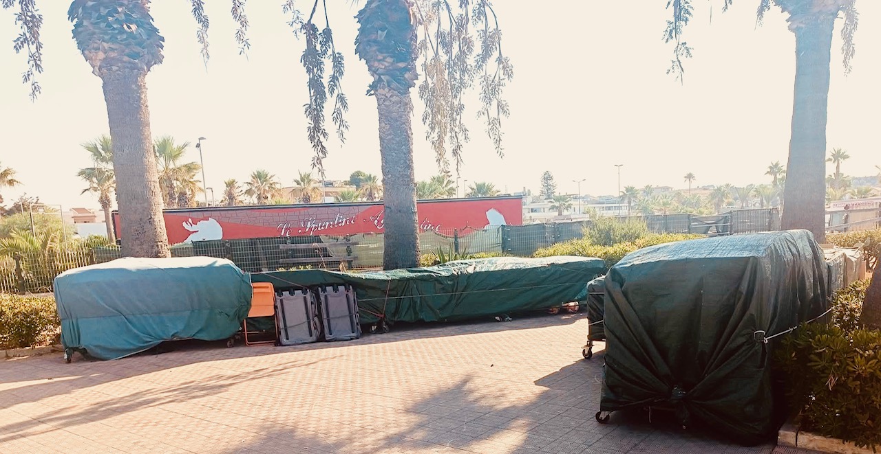 La foto che pubblichiamo oggi è stata scattata proprio a San Leone e mostra le bancarelle coperte da teloni verdi, allineate sul lungomare. In molte di queste, denunciano i residenti, i venditori non si limitano a stoccare la merce contraffatta: vi pernottano e vi soggiornano, trasformando il marciapiede in un accampamento improvvisato.