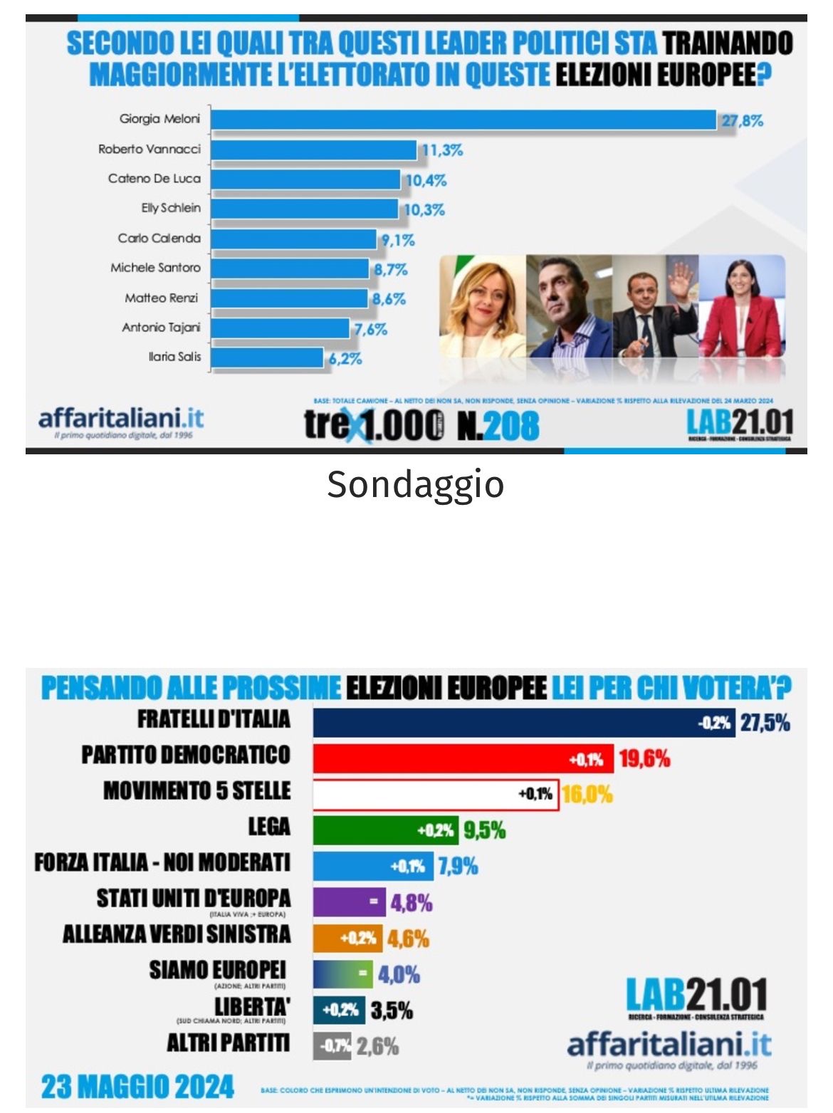 Sondaggi Europee: FdI giù, Pd sotto il 20%, Lega al 9,5. Leader, Cateno De Luca batte Schlein