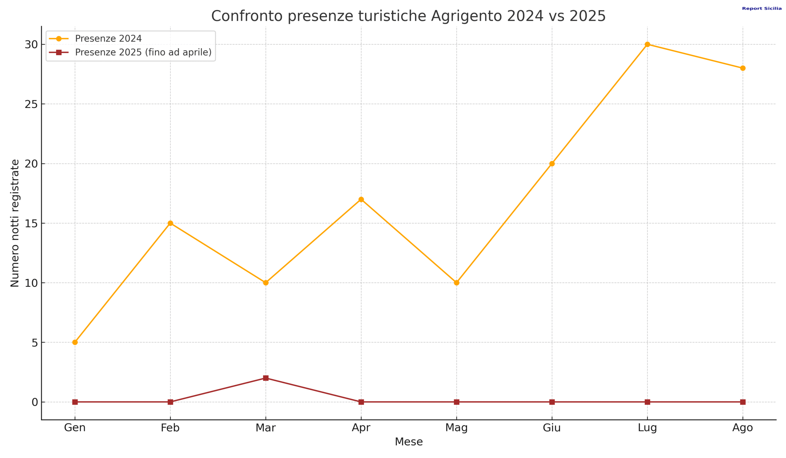 Ecco l’infografica integrata richiesta. Il grafico mostra chiaramente la netta differenza tra le presenze turistiche nei primi mesi del 2024 e del 2025 ad Agrigento, smentendo qualsiasi ipotesi di crescita reale a fronte del crollo documentato fino ad aprile 2025.