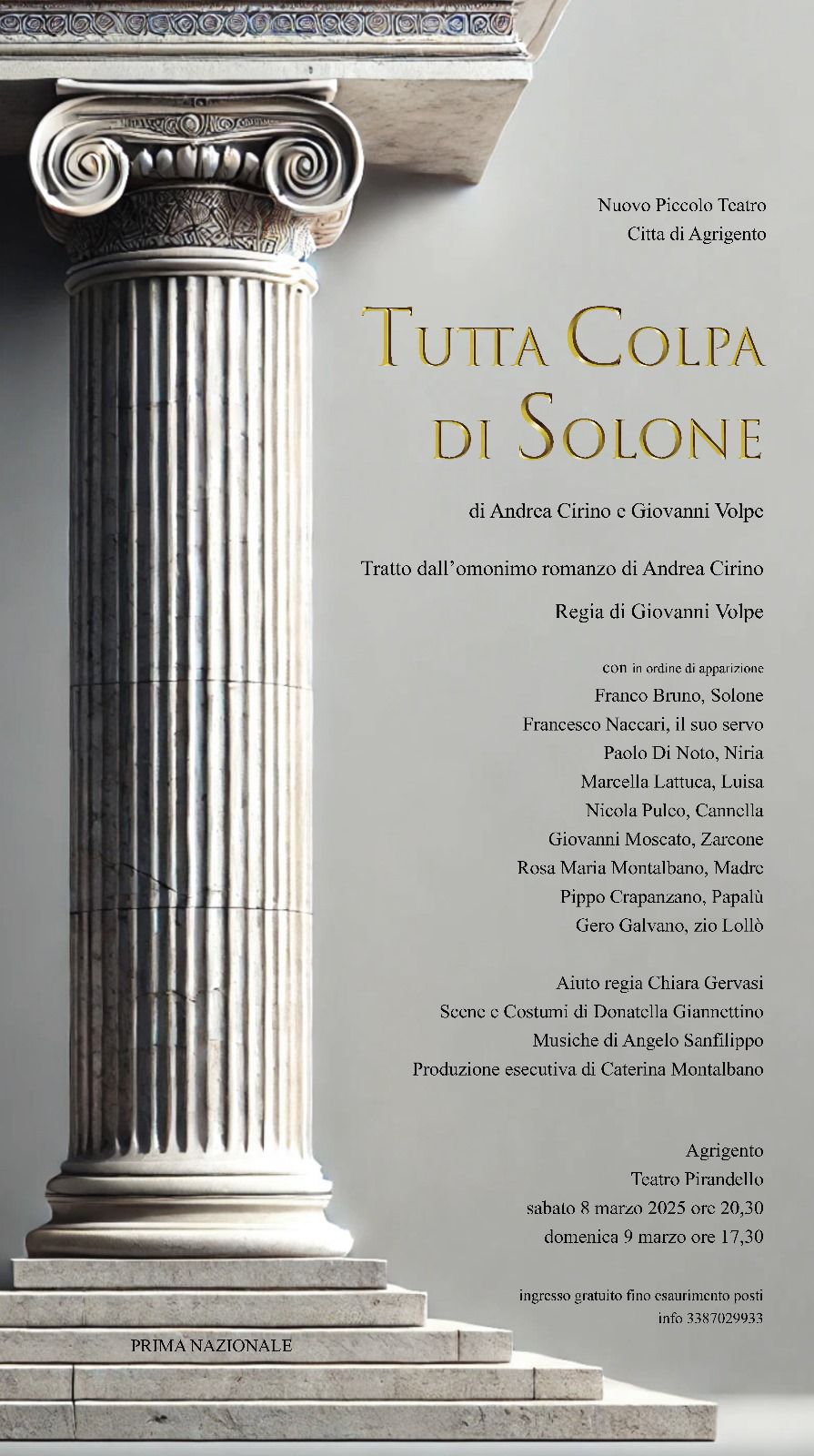 Un evento culturale di grande rilievo si prepara a debuttare ad Agrigento: il Nuovo Piccolo Teatro presenta la prima nazionale di “Tutta Colpa di Solone”, opera teatrale scritta da Andrea Cirino e Giovanni Volpe, tratta dall’omonimo romanzo di Andrea Cirino. La regia è affidata a Giovanni Volpe, con la produzione esecutiva di Caterina Montalbano.