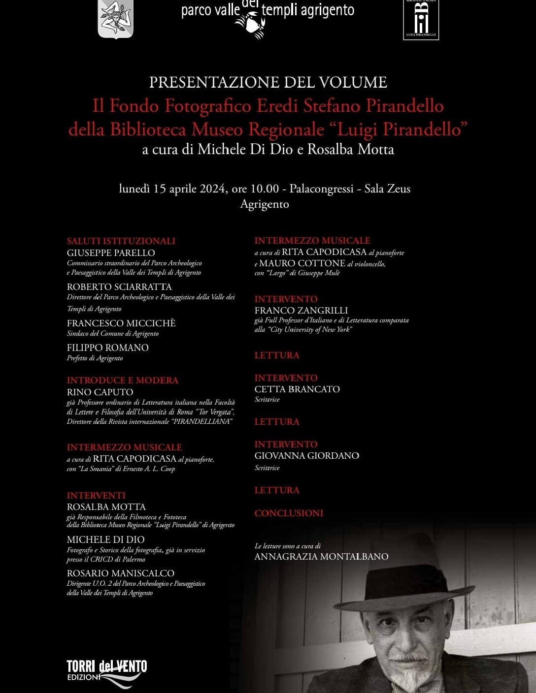 Lunedì 15 aprile 2024, alle 10.00, nella Sala Zeus del Palacongressi, avrà luogo la presentazione del volume dedicato al Fondo Fotografico Eredi Stefano Pirandello della Biblioteca Museo Regionale “Luigi Pirandello”. Un volume – Edizioni Torri del Vento – curato da Michele Di Dio e Rosalba Motta, che rappresenta un importante contributo alla conoscenza e alla valorizzazione del patrimonio detenuto dall’istituzione bibliotecaria, sito dipendente del Parco Archeologico Paesaggistico della Valle dei Templi di Agrigento.