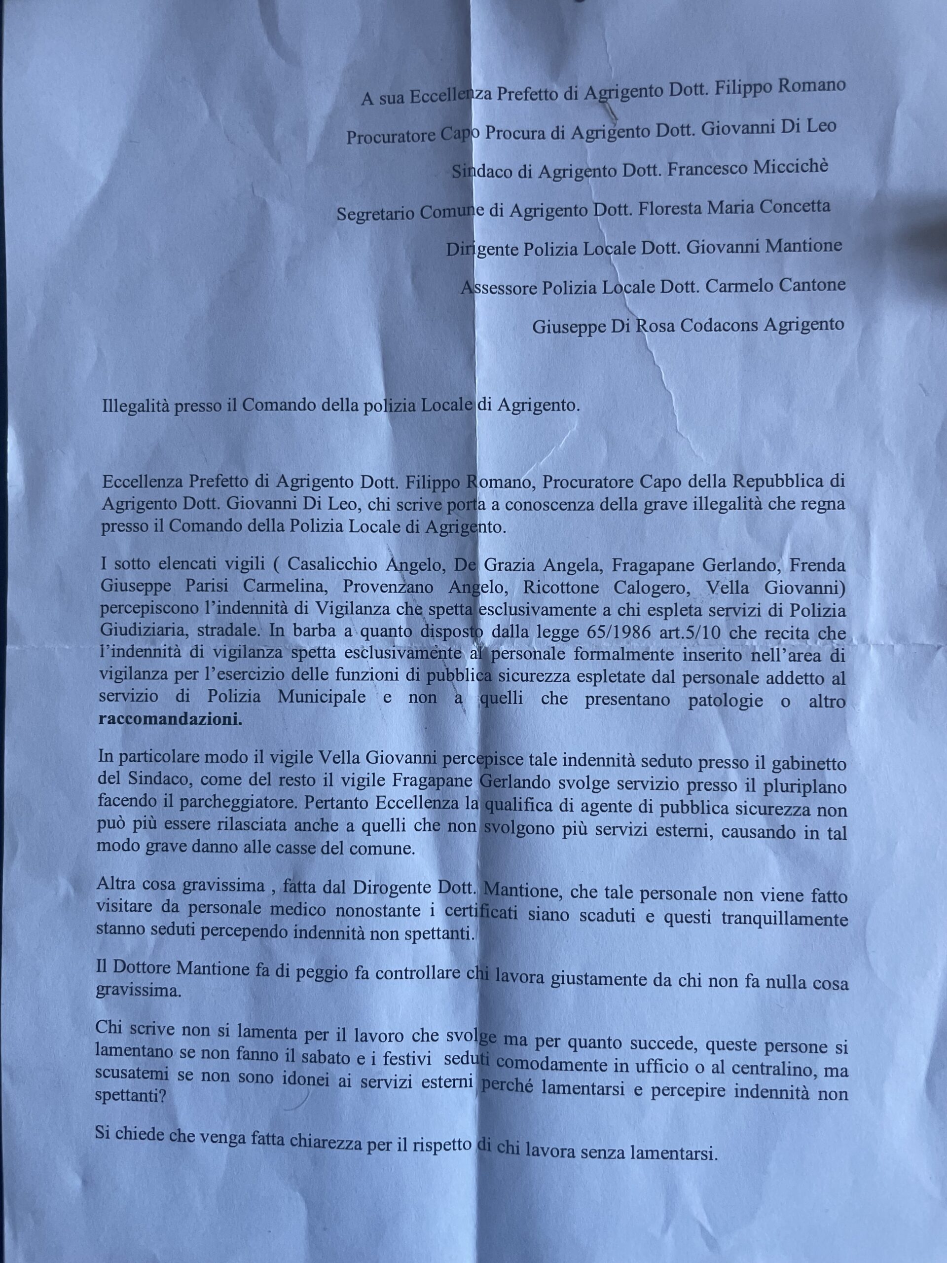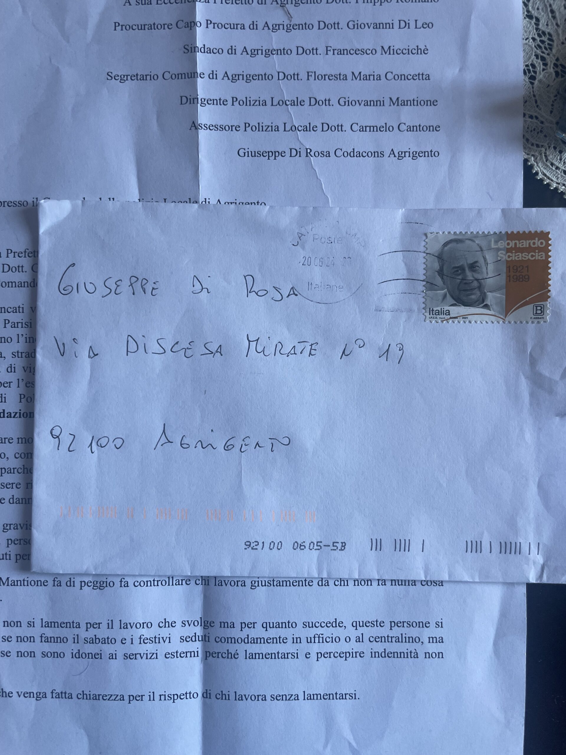 Lettera “anonima” rinvenuta nella mia cassetta della posta 3 giorni fa ma si presume lasciata qualche giorno prima , ora dico, ma non pensate che come ci metta la faccia io nelle mie denunce dobbiate mettercela anche voi? Se io predico che “questa città se non ci mettiamo la faccia tutti non se ne uscirà mai dallo stato MAFIOSO in cui si trova”, come potete pensare di mandarmi una lettera anonima e che io agisca di conseguenza? Non sarebbe stato più giusto consegnarmi gli appunti o la stessa lettera DE VISU e parlare di ciò che avevate scritto? Mah e poi mah