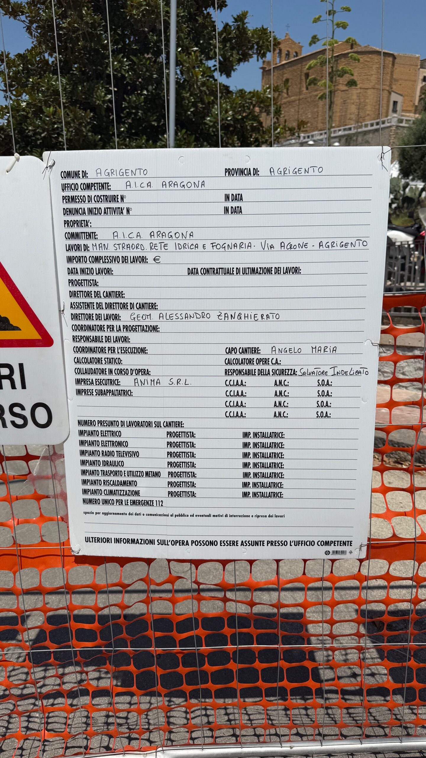 Davanti all’area da settimane oggetto di lavori per la riparazione della rete idrica e fognaria da parte di AICA, è ora visibile una tabella informativa intestata all’ente idrico, con l’indicazione del direttore dei lavori (Geometra Alessandro Zanghierato), del capo cantiere (Angelo Maria), e della ditta esecutrice (ANIMA S.R.L.). I cartelli sono stati affissi solo nelle ultime ore, a conferma del fatto che fino a pochi giorni fa nessuna comunicazione formale era stata resa pubblica.