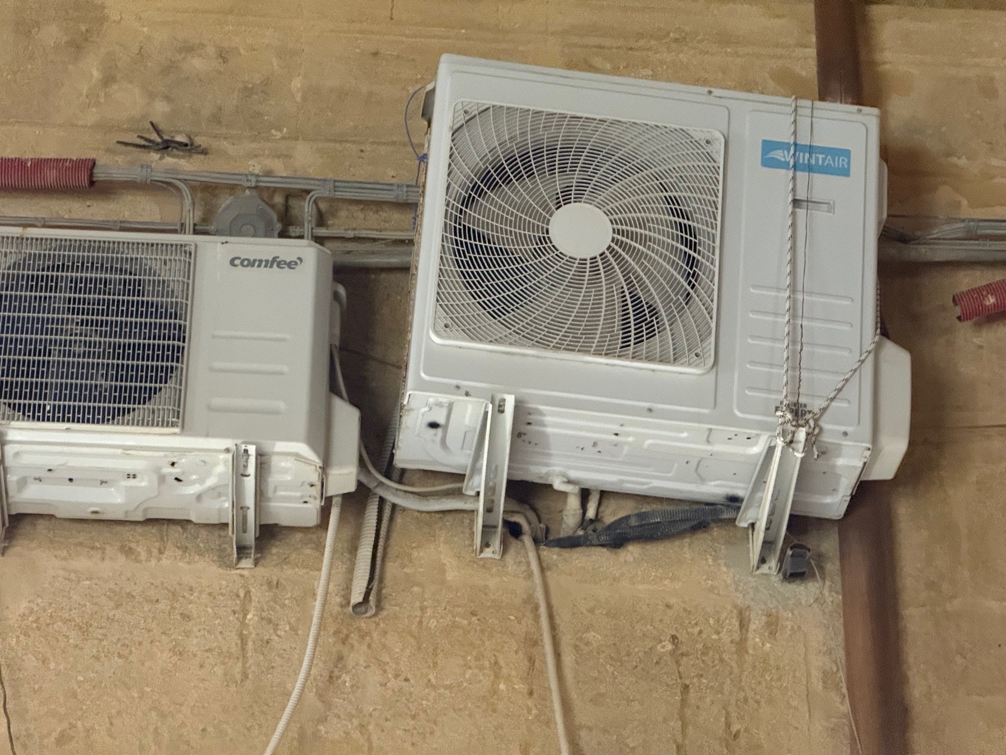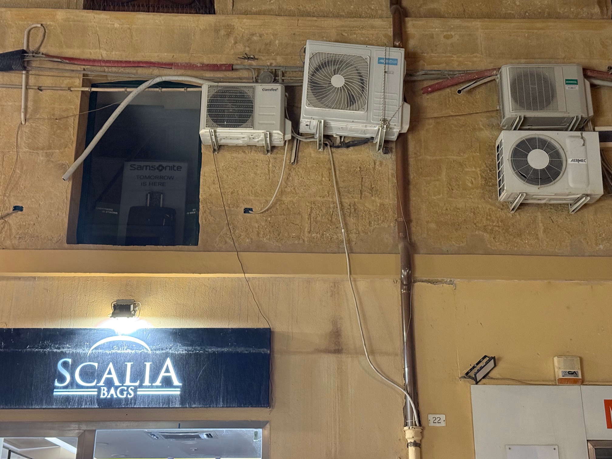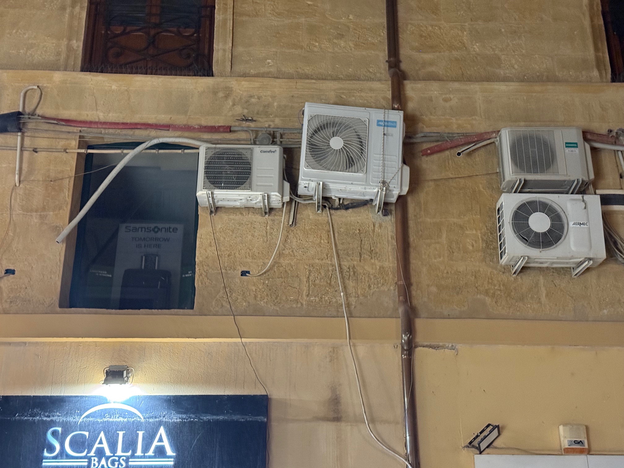 AGRIGENTO – La scena è da brividi, e non certo per l’aria condizionata. In piena via Atenea, al civico 22, proprio sopra il noto negozio di pelletteria “Scalia Bags”, un grosso climatizzatore esterno risulta fissato con una semplice corda alla parete di un edificio appena ristrutturato, lo stesso che dovrebbe ospitare una futura sede universitaria.