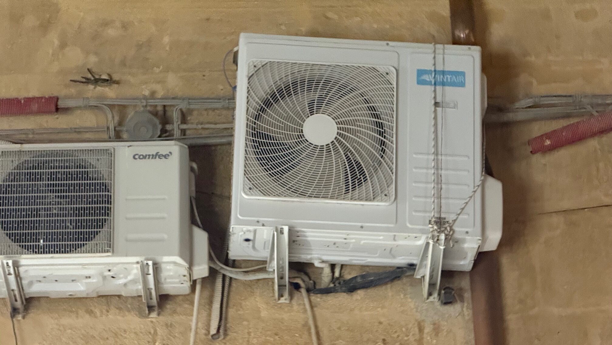 L’impianto – di dimensioni notevolmente superiori rispetto agli altri climatizzatori installati sulla stessa facciata – è sospeso in modo precario, con evidenti segni di instabilità e cavi penzolanti. Le foto parlano chiaro: non si tratta di una fissazione tecnica a norma, ma di una soluzione improvvisata che espone i pedoni a un potenziale pericolo.
