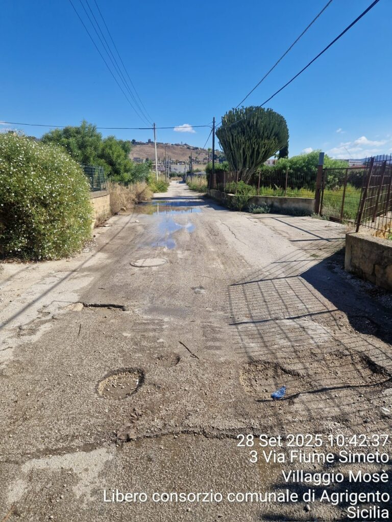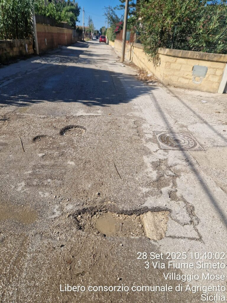 Agrigento – Nella rubrica “Le segnalazioni dei nostri lettori” oggi pubblichiamo la denuncia del signor Vincenzo Albanese, residente in via Fiume Simeto al Villaggio Mosè, che da tempo sollecita l’Amministrazione comunale ad intervenire per garantire la sicurezza stradale.