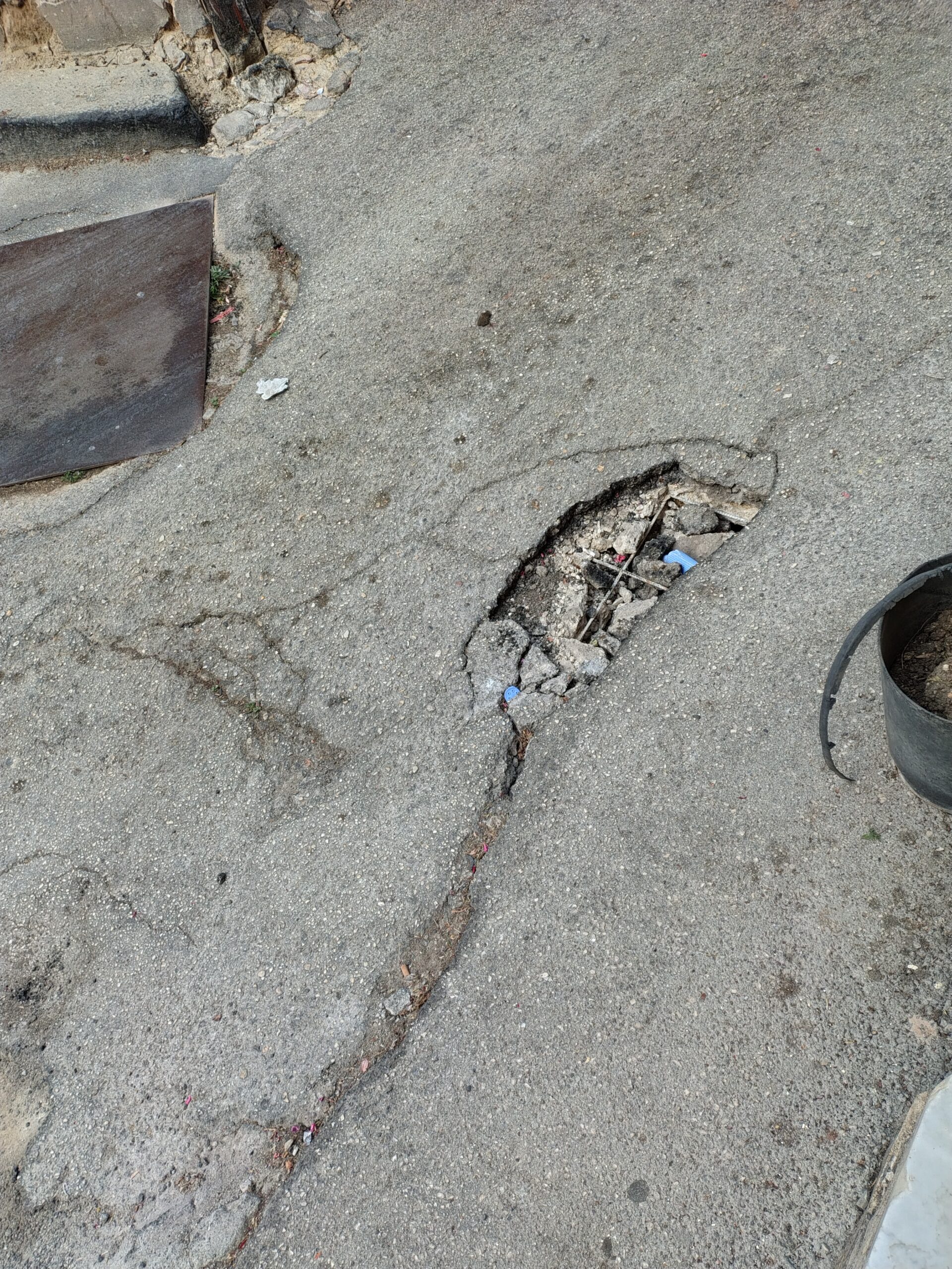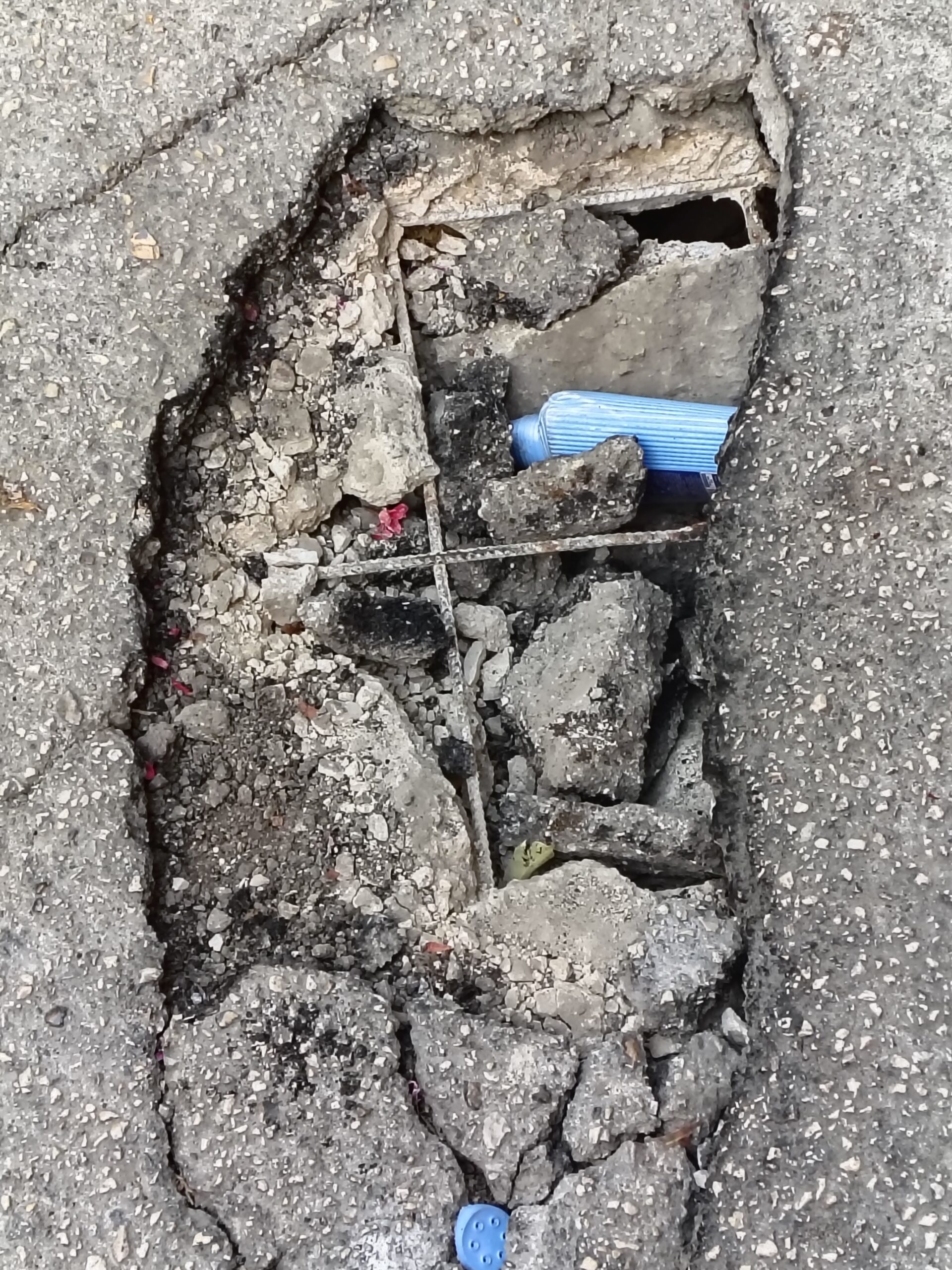 Voragini aperte e ferraglia a vista sotto il manto stradale;