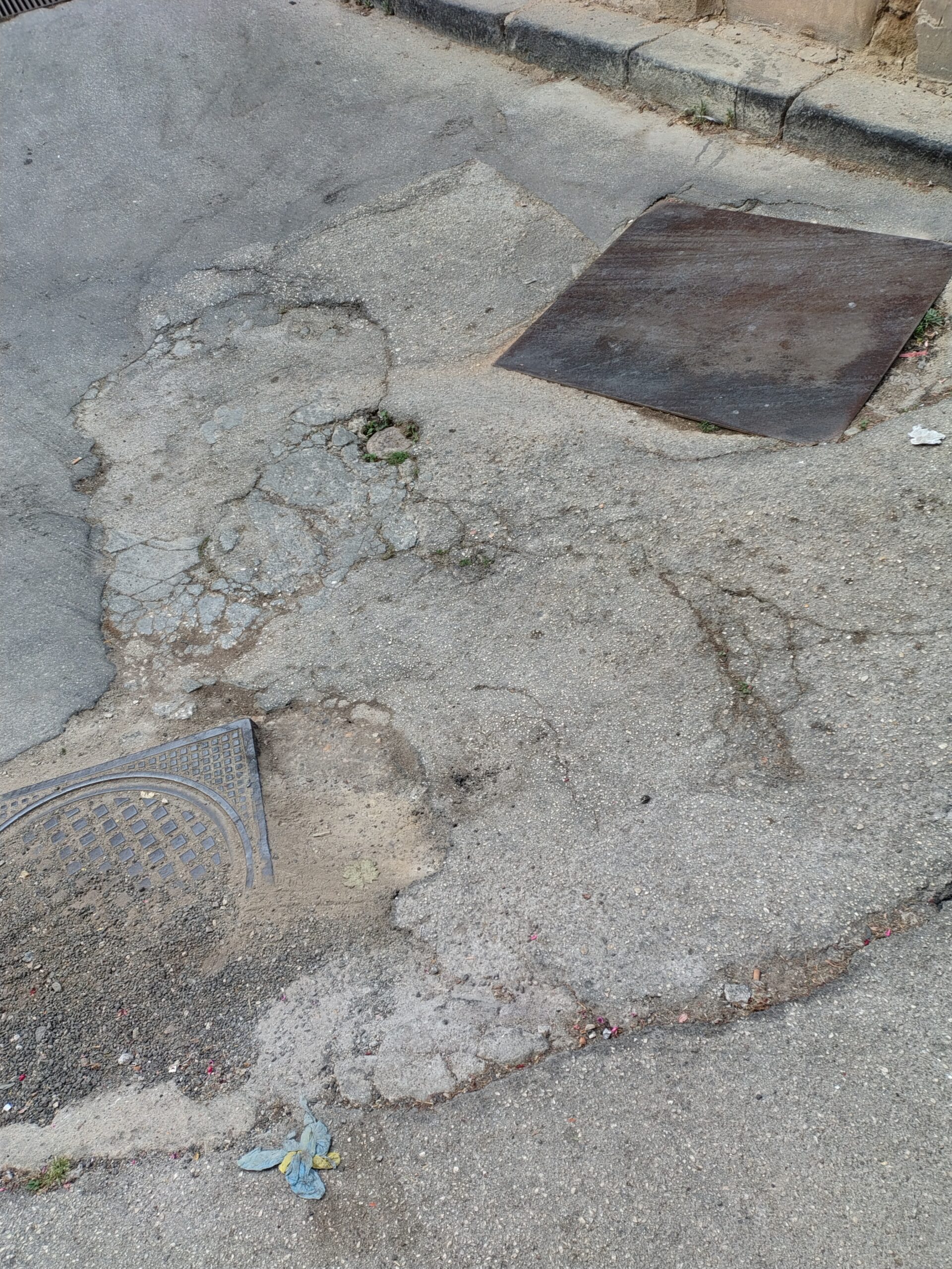 Tombini collassati e ricoperti in modo precario da lamiere arrugginite;