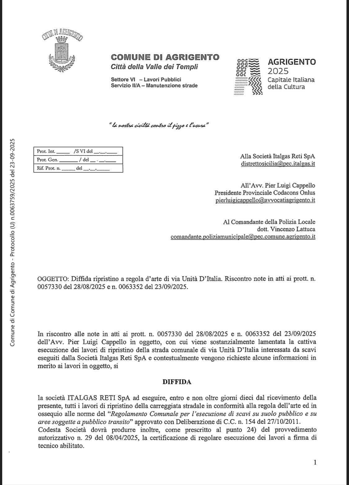 AGRIGENTO – Dopo le ripetute segnalazioni dei residenti e il sollecito dell’avvocato Pier Luigi Cappello, il Comune di Agrigento è intervenuto con un atto ufficiale nei confronti della società Italgas Reti S.p.A., diffidandola a procedere al ripristino del manto stradale in via Unità d’Italia.