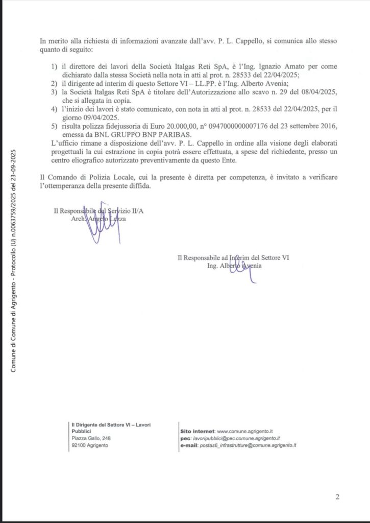 La diffida impone inoltre alla Italgas di produrre la certificazione di regolare esecuzione dei lavori a firma di tecnico abilitato, come previsto dall’autorizzazione n. 29 dell’8 aprile 2025.