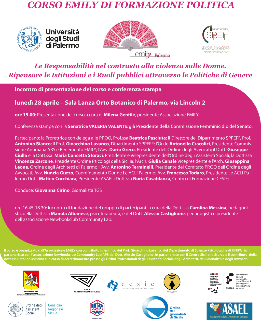 Milena Gentile, presidente dell’associazione “Emily”, presenterà il corso a partire dalle 15:00 durante la conferenza stampa a cui partecipano la senatrice Valeria Valente già presidente della Commissione Femminicidio del Senato, la prorettrice con delega alle pari opportunità, professoressa Beatrice Pasciuta, il direttore del Dipartimento SPPEFF, professore Antonino Bianco, il professore Gioacchino Lavanco del Dipartimento SPPEFF, l’onorevole Antonello Cracolici, presidente della Commissione Antimafia all’ARS e benemerito di “Emily”, l’avvocato Dario Greco, presidente dell’Ordine degli Avvocati, il dottore Giuseppe Ciulla e la dottoressa Maria Concetta Storaci, rispettivamente presidente e vicepresidente dell’Ordine degli Assistenti Sociali, la dottoressa Vincenza Zarcone, presidente dell’ Ordine degli Psicologi della Sicilia, gli architetti Giulia Canale e Giuseppina Leone dell’ Ordine degli Architetti di Palermo, l’avvocato Antonino Terminelli, presidente del Comitato Pari Opportunità dell’Ordine degli Avvocati di Palermo, l’avvocato Nunzia Guzzo del Coordinamento Donne delle ACLI di Palermo e l’avvocato Francesco Todaro, presidente delle ACLI Palermo, il dottore Matteo Cocchiara presidente dell’ASAEL e la dottoressa Nuria Casablanca del Centro di Formazione CEIPES.